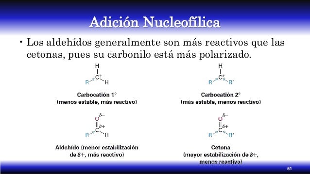 Es la reacción más común de los aldehídos y cetonas, implica la adición de un nucleófilo al carbono, electrófilo, del grupo carbonilo, puesto que el nucleófilo emplea su par de electrones para formar el nuevo enlace con el carbono, los dos electrones forman un doble enlace C=O, deben desplazarse hacia el átomo de oxígeno, que es más electronegativo. Donde son estabilizados y se forma un anión alcóxido, como un compuesto de intermedio, es tetraédrico.